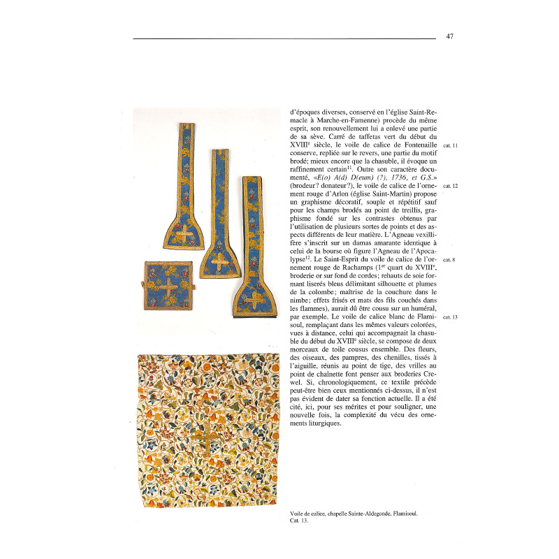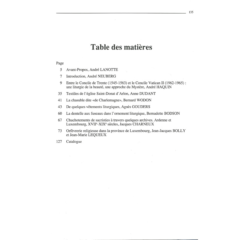Calices, ciboires, ostensoirs, ornements chatoyants firent les « Beaux dimanches d’autrefois », jusqu’au cœur de nos églises les plus humbles. Orfèvrerie et ornements mobilisaient tous les prestiges, toutes les séductions de l’art au service de la liturgie. L’ouvrage fournit, entre autres, des renseignements inédits sur les ateliers d’orfèvrerie luxembourgeois sous l’Ancien Régime, mais aussi un éclairage nouveau sur les vêtements liturgiques anciens de notre province.