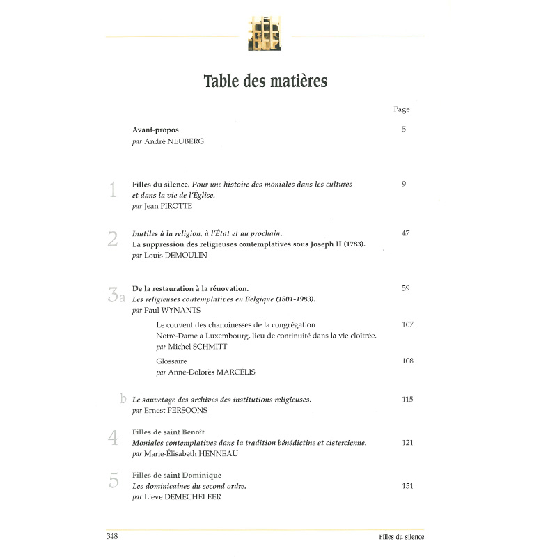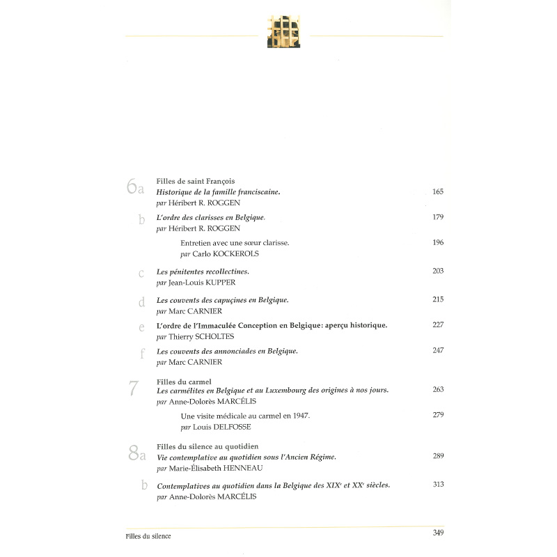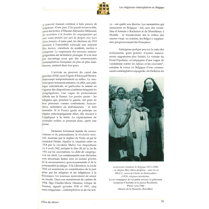 Le secret des clôtures des couvents de congrégations religieuses féminines a toujours suscité un intérêt particulier, voire des fantasmes, chez le commun des mortels. Et pourtant, la vie des filles du silence est empreinte de simplicité et de sérénité malgré la sévérité et l’austérité de la règle d’antan. Pour écrire l’histoire des Moniales, les religieuses de nombreux couvents ont entrouvert spontanément les grilles de clôture et révélé une admirable joie de vie intérieure alliée à une grande connaissance des « choses de ce monde ». Rédigé en collaboration avec les Archives Générales du Royaume, l’ouvrage est publié également en néerlandais