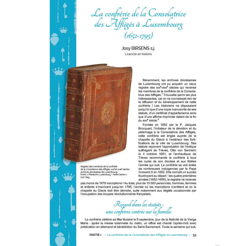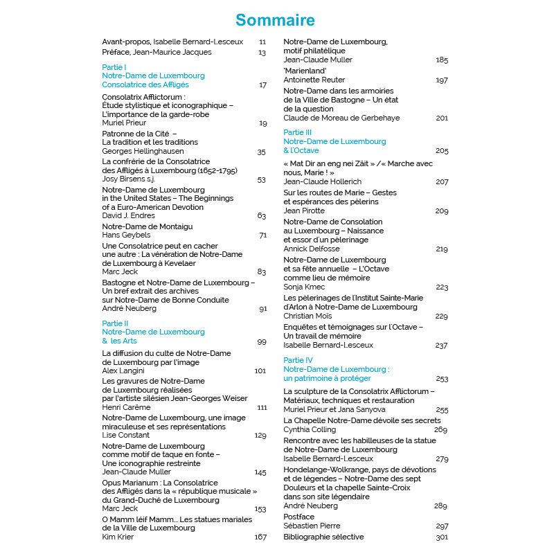 Cet ouvrage, abondamment illustré, est le fruit de nombreuses collaborations transfrontalières qui abordent de façon nouvelle ou inédite des thèmes liés à la dévotion envers Notre-Dame de Luxembourg et aux nombreuses représentations qu’elle suscite mais aussi à la conservation de ce patrimoine.