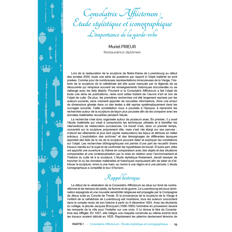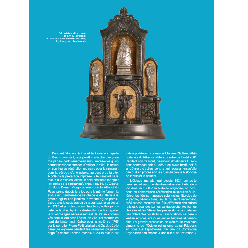 Le culte et sa diffusion sont replacés dans leur cadre historique. Sa pratique est détaillée dans ses manifestations les plus visibles comme l’Octave ou l’habillage de la statue. Les aspects iconographiques sont quant à eux traités selon les artistes ou les différents supports, tels le papier, la pierre, la fonte ou le verre. La restauration et la conservation de la statue, présentées par la restauratrice elle-même, apportent un nouvel éclairage sur les origines de l’image. Des thèmes inédits comme les chants mariaux, les résultats des fouilles de la chapelle du Glacis, l’émission en 2016 d’un nouveau timbre à l’effigie de la Consolatrice prouvent, s’il le fallait encore, que l’étude de Notre-Dame de Luxembourg est un sujet inépuisable car profondément humain.
